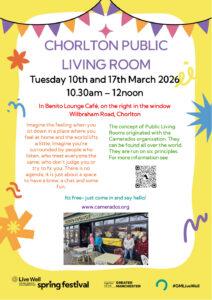 As part of the GM Live Well Spring festival, we’ll have not one but TWO Camerados Public Living Rooms, right in the centre of Chorlton.