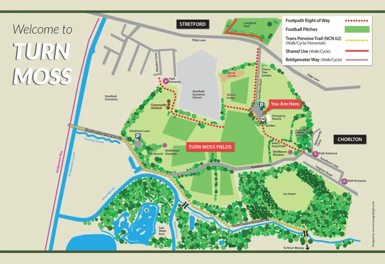 The fields lie alongside the River Mersey, Bridgewater Canal and Trans-Pennine Trail, making them a perfect site to become Trafford’s Gateway to The Mersey Valley. .
